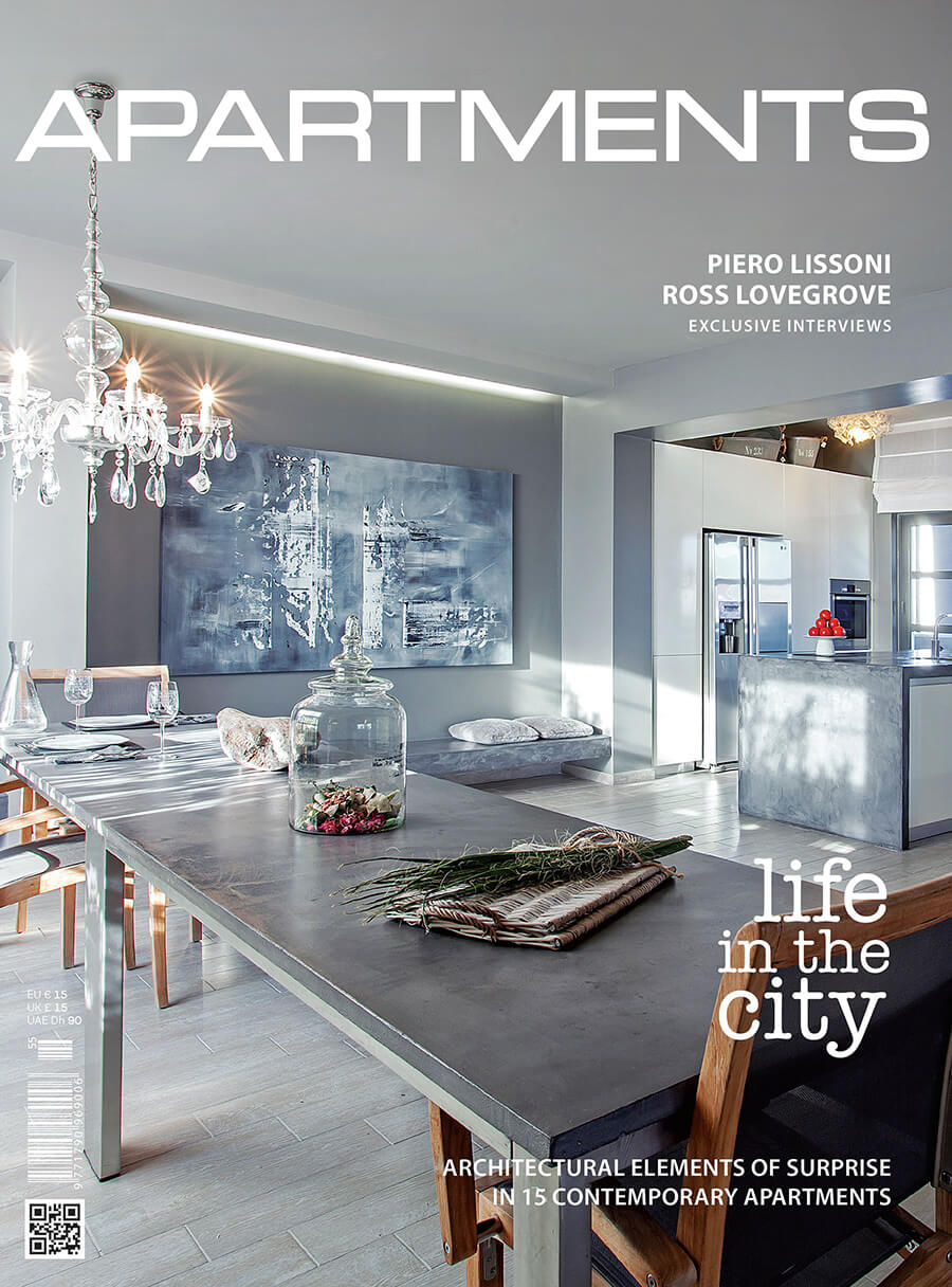 The annual international bookazine Apartments 2015, features interviews of the Italian architect Piero Lissoni and of the industrial designer Ross Lovegrove, along with 15 presentations of unique apartments from all over the world.