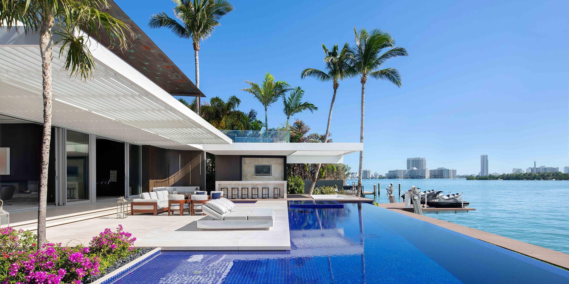 The setting for this Miami house is on a pie shaped lot on the southern tip of Dilido Island with superb views of the islands, downtown and South Beach. The house spills out onto the longer, waterfront elevation and draws on the jet-set lifestyle of Biscayne Bay, to evoke the experience of being on the deck of a super yacht. Multiple events unfold on this versatile terrace whose defining characteristic – the harmonious merging of internal and external living spaces – is a theme carried throughout the house.