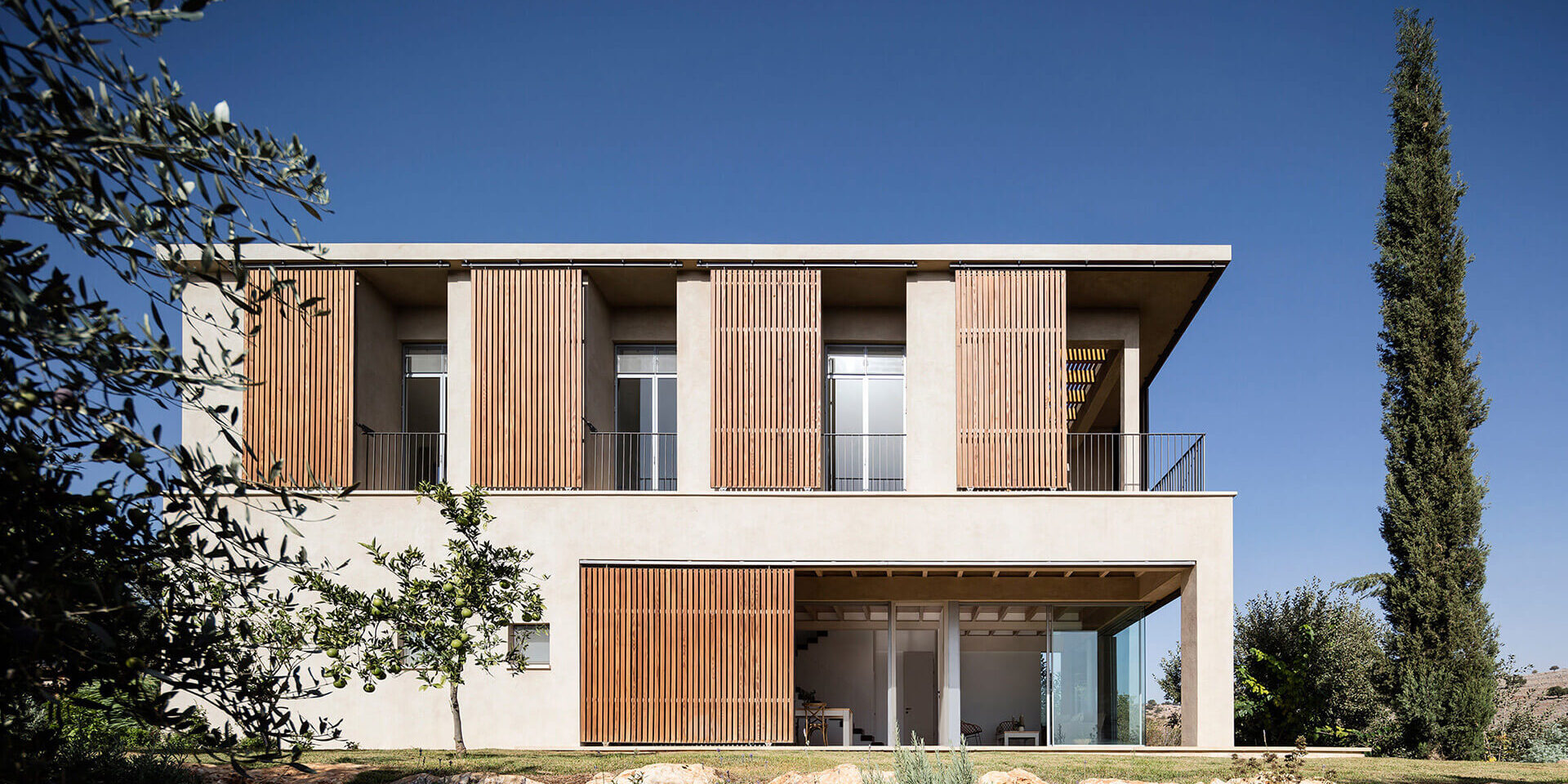 The generous openings facing the view to the South and East require the provision of shading and filtering against the intense sun. Thus, custom designed wooden shutters slide in adjustment to the position of the sun and privacy requirements. The shutter lattices, as typical of Mediterranean mashrabiya, block views inwards and maintain privacy, while allowing views of the scenery from the inside. The windows and doors behind the shutters are recessed, creating intermediate shaded semi-outdoor areas that offer milder climate conditions, keeping the house cool and pleasant even during the very hot days of summer.