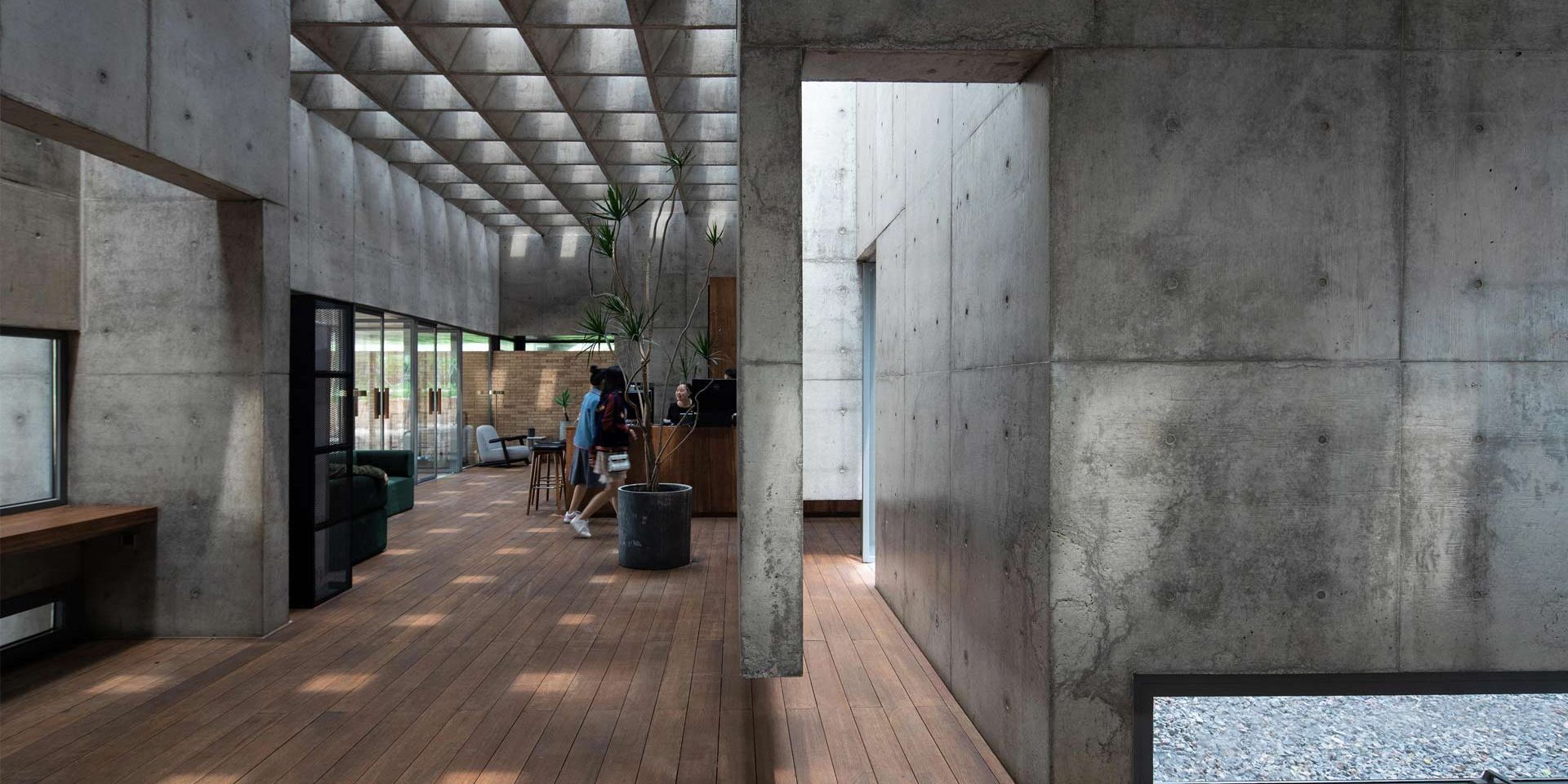 Trees are interlocked within the fragmented spatial boundary and courtyards. The architecture appears as a non-directional canopy floating above the undulating landscape, looming in the woods. From top to bottom, the tree crowns, building roof, and dining area underneath constitute the three major layers in the section sequentially. Tree branches sway with the sea breeze and cast their shadow through the skylights onto the wall and floor. The dining space becomes animated with the flickering of light and shadow, cultivating another dimension of indirect engagement between space and nature. The inner tree courtyards bring light and airflow deep into the restaurant, and at the same time, like hinges, they anchor the space. The courtyards simultaneously divide and connect the surrounding spaces. The full height fair-faced cast-in-place concrete walls of the courtyards resist the sheer force of the whole building, which makes it possible to support the load of the thick eaves on columns of only 120mm in diameter. This way, the slender steel elements, similar in diameter to the surrounding tree trunks, blend in the surrounding woods.