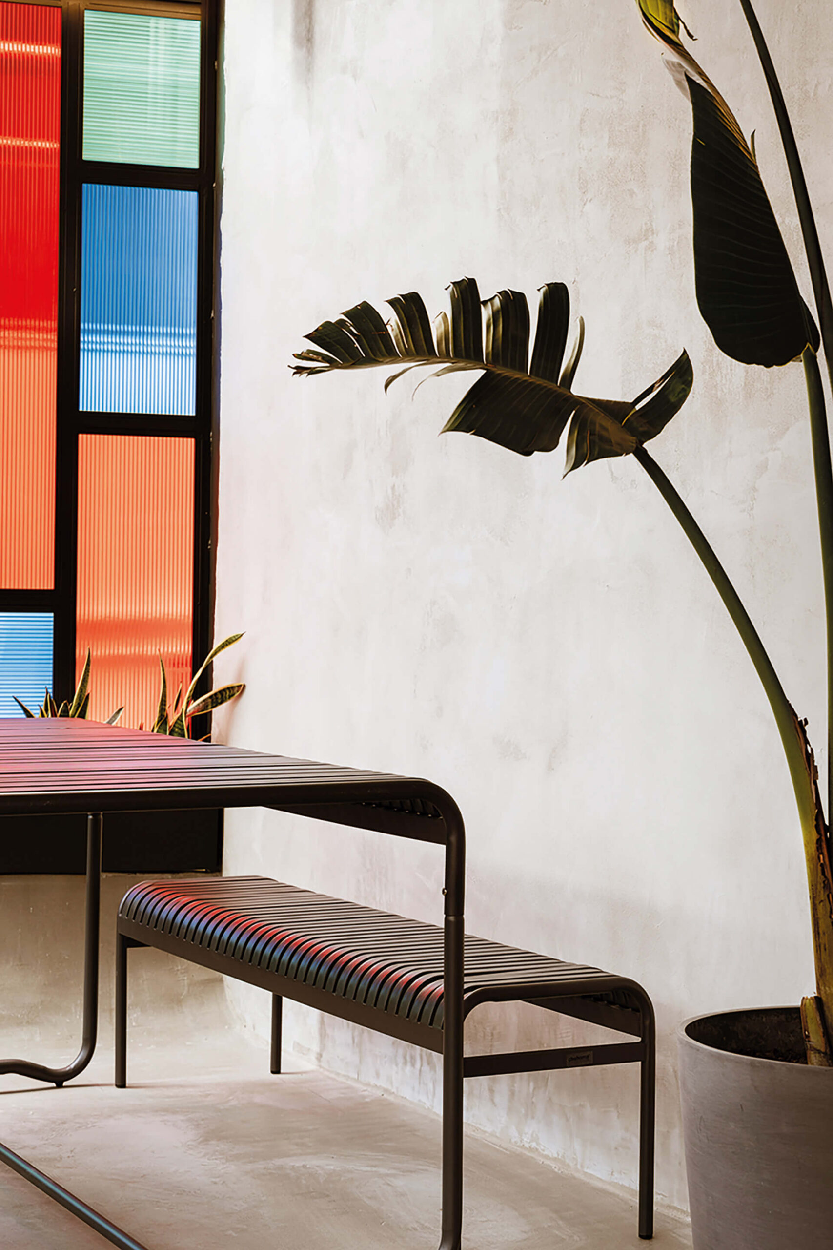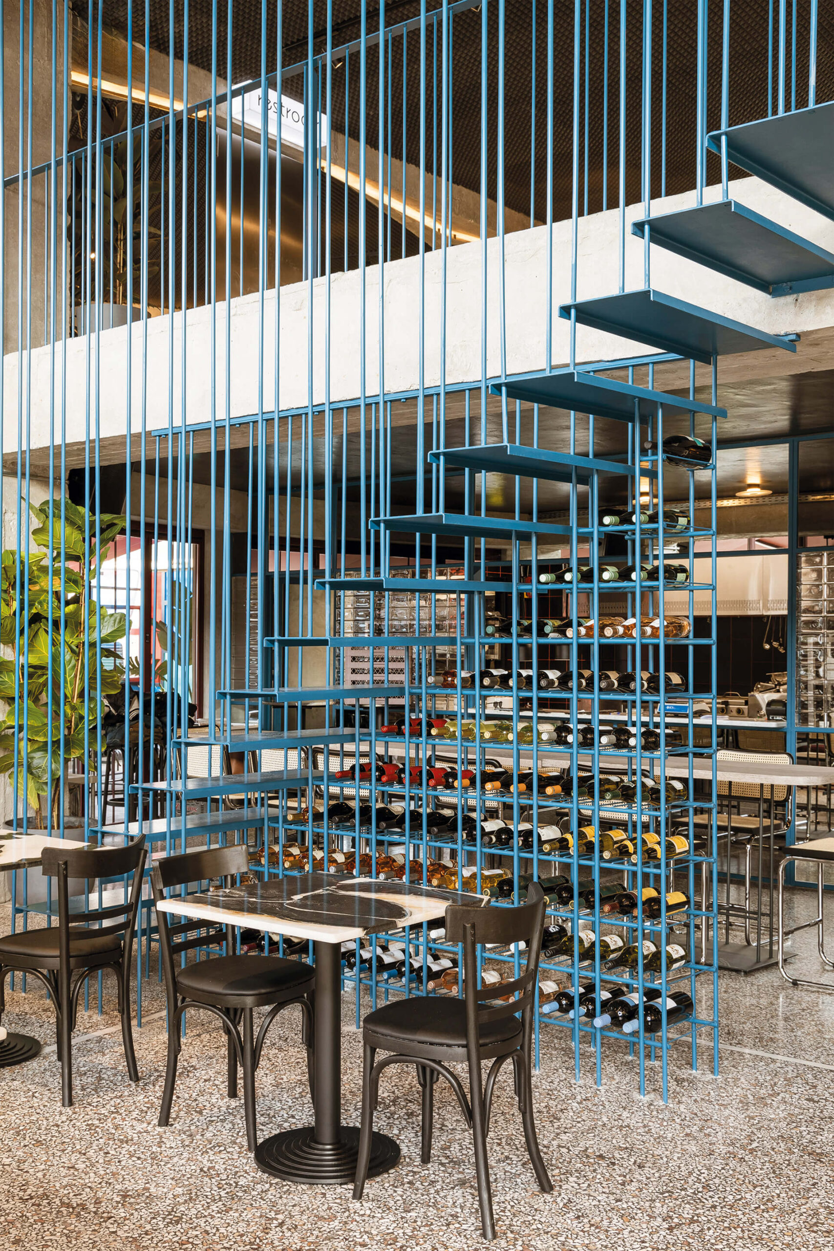 A key element of the restaurant is the sculptural metal staircase leading to the secluded mezzanine, which also functions as a display surface for wines. Its industrial character reinforces the identity of the building, while its bold color introduces an artistic accent within the otherwise neutral setting. The upper level accommodates a lounge area, ideal for working or reading during the day, as well as a retail corner featuring a curated selection of accessories and clothing.