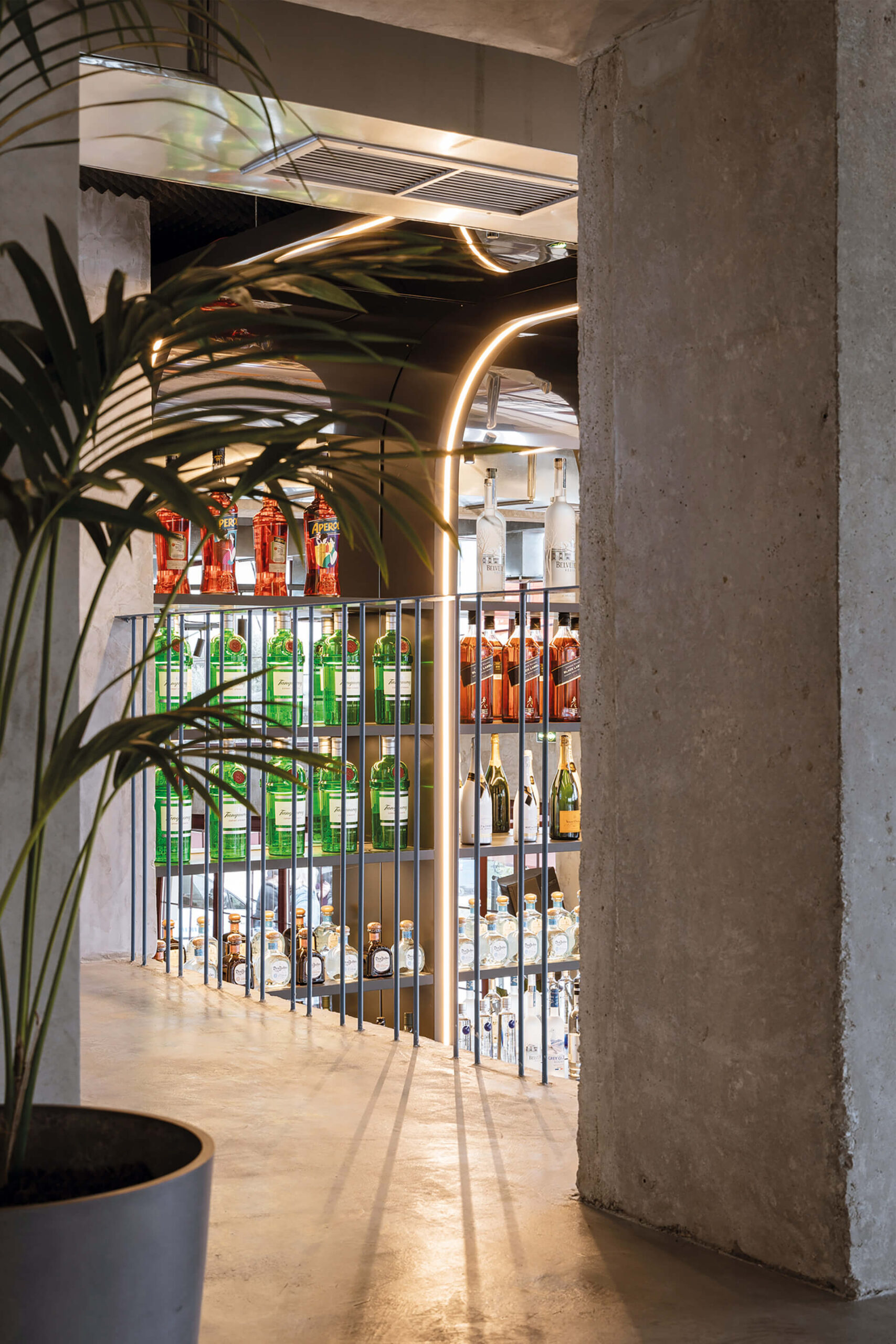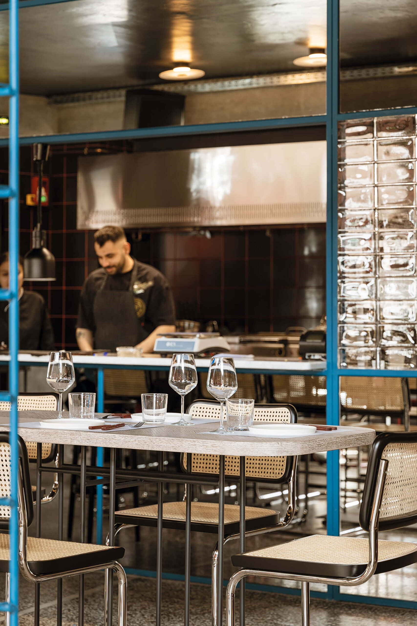 The interior preserves the restrained aesthetic of exposed concrete while incorporating distinctive features, such as a striking bar set against a 3.5-meter-high backdrop and a counter clad in tin. The dining area offers a variety of seating options, including banquettes paired with custom-designed marble tables and vintage chairs. At the rear, the open kitchen with its glass frontage adds vibrancy and a sense of interaction. The presence of plants, combined with a diverse selection of furniture and architectural elements, creates a layered experience, with different spatial qualities unfolding in every corner.