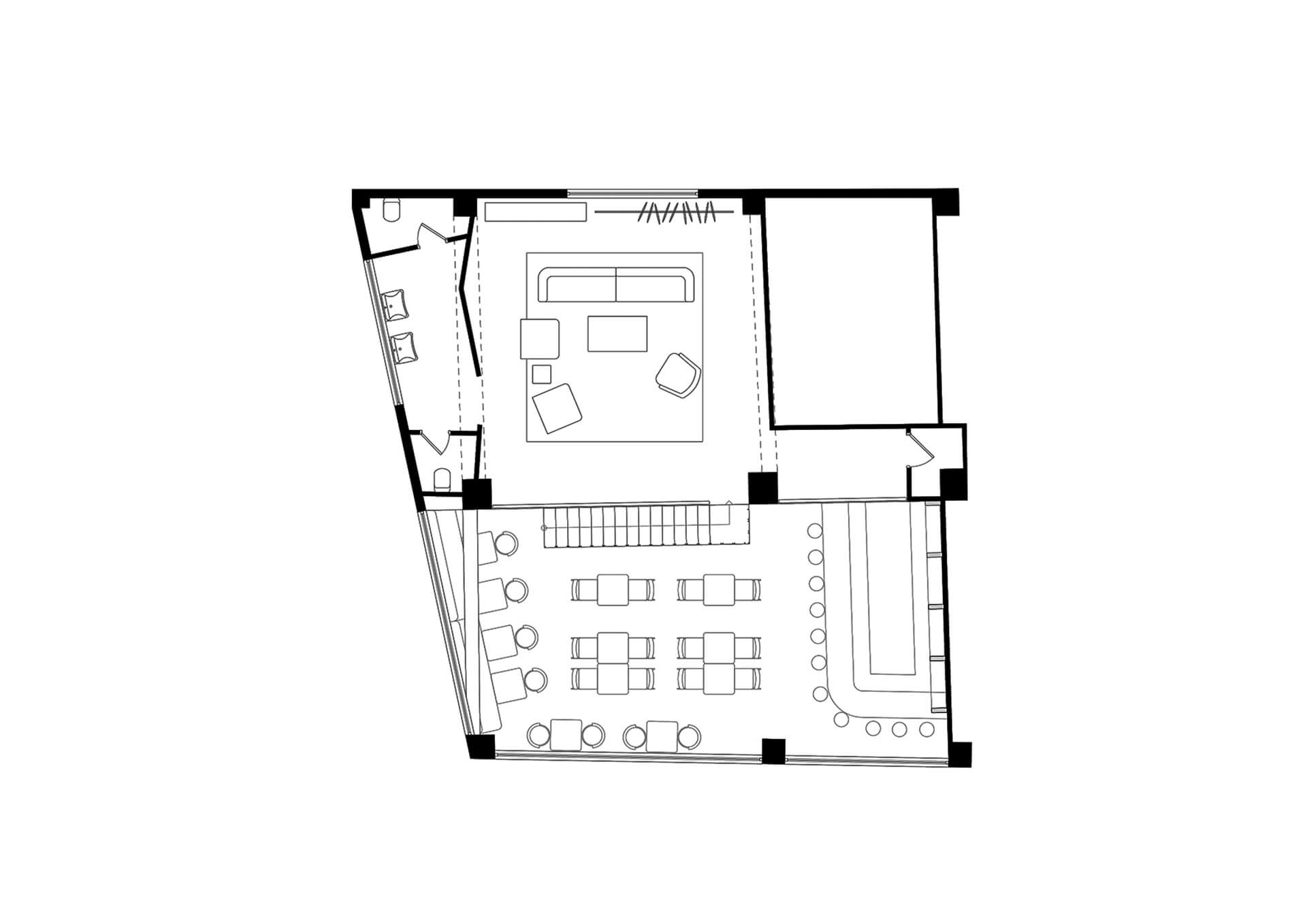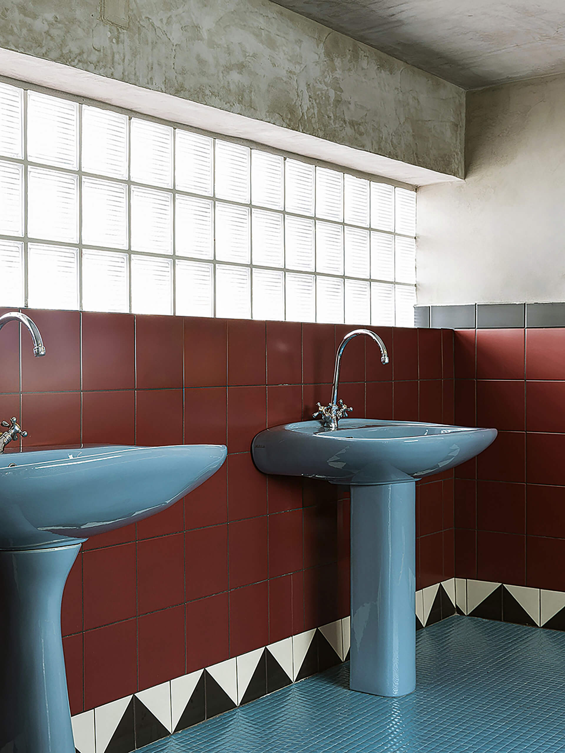 The existing terrazzo flooring, with its three-color composition, lends a nostalgic touch to the space. Yellow leather details on the bar stools complement the overall color palette. The combination of diverse styles and textures -raw concrete, polished cement, glass blocks, and the leather-clad bar front- creates an atmospheric and dramatic setting. The final result is a two-level space that blends pop and classic culture, luxury and informality, quiet daytime moments and vibrant nightlife.