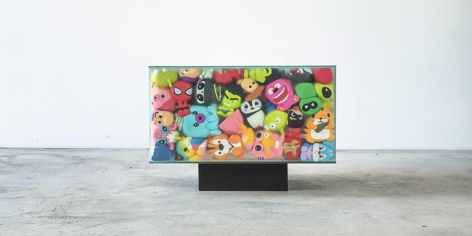 The new, limited edition Squishies table is filled densely with squishy toys from wall to wall. These living animated characters are packed so tight, their breath escapes their lungs only to frost the glass that encloses them.