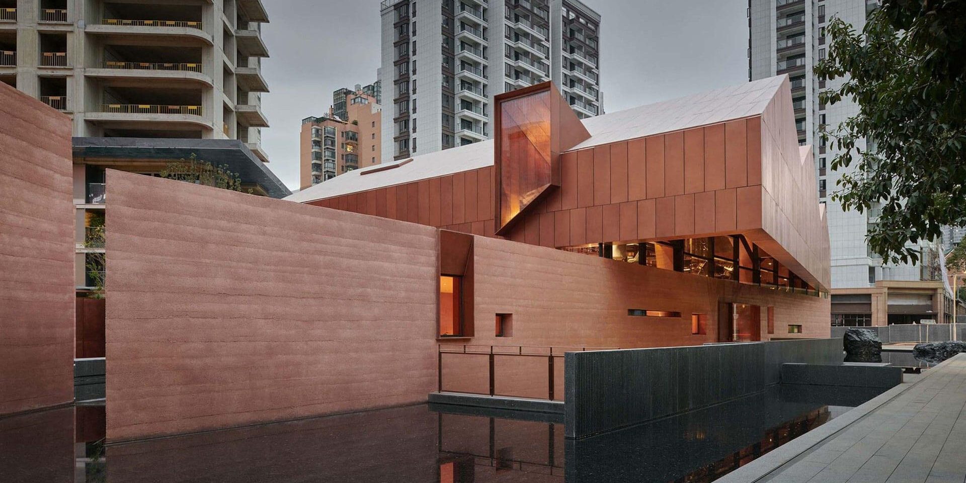 Envisioned as a house atop a rock, the teahouse is elevated above a rammed concrete base, while its sweeping copper roof echoes the roofline of the enclosed architectural relic. Its core material, rammed concrete, is a modern homage to the traditional earthen dwellings of the region, emphasizing a raw monumentality. Visitors are presented with two images of the building upon approach: the upright silhouette of the form, and its mirrored reflection duplicated in the surrounding pool of water.