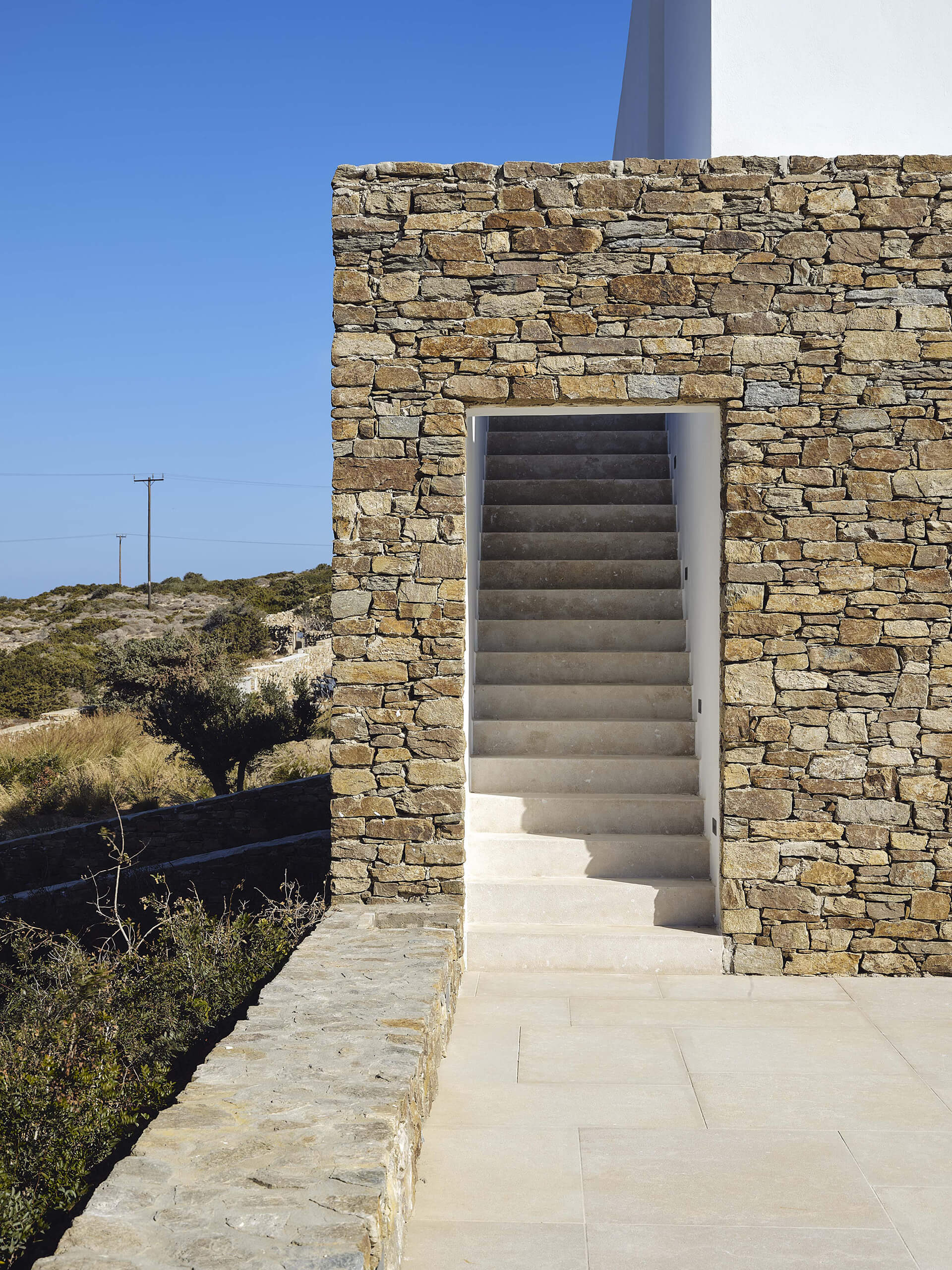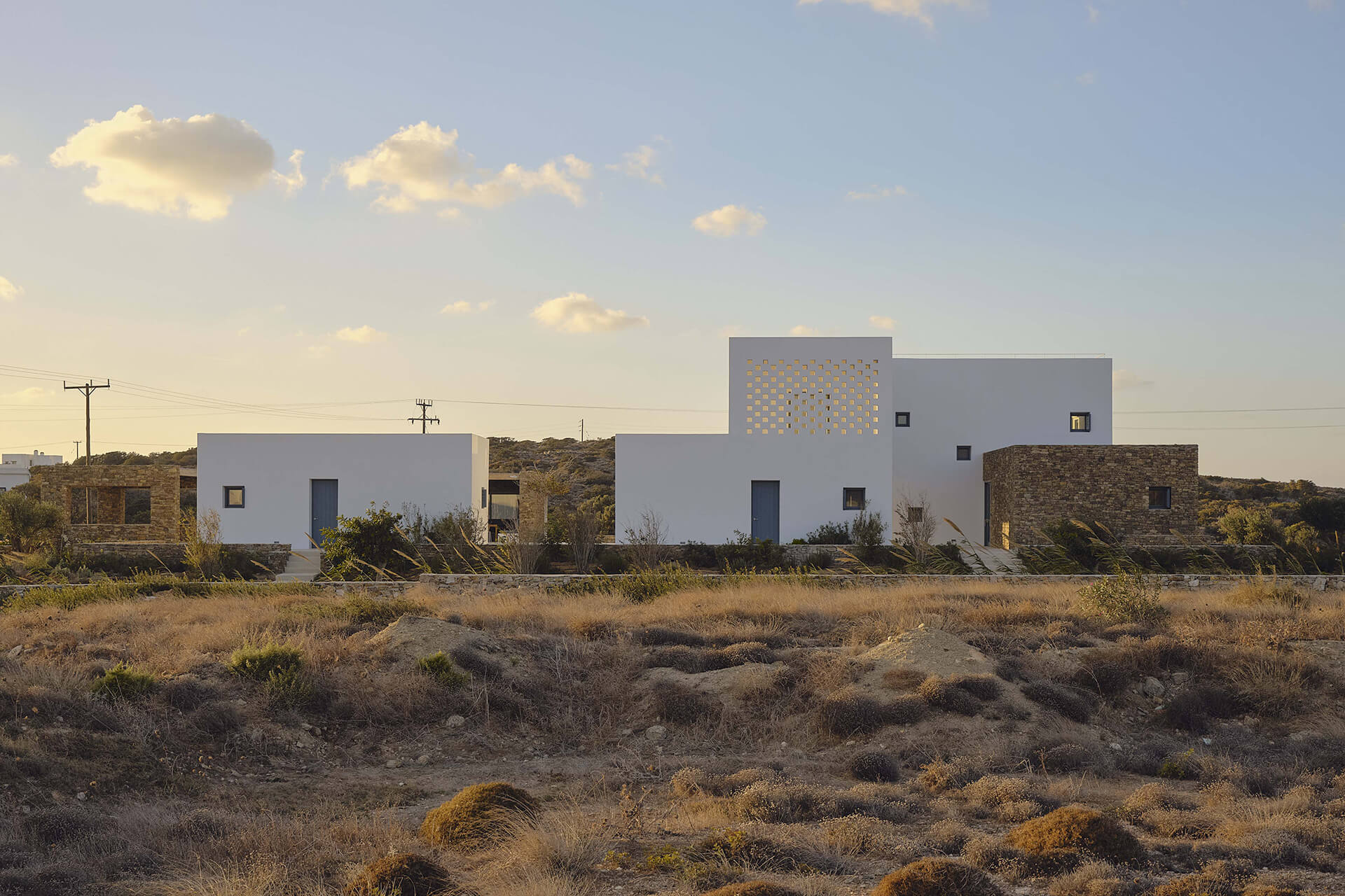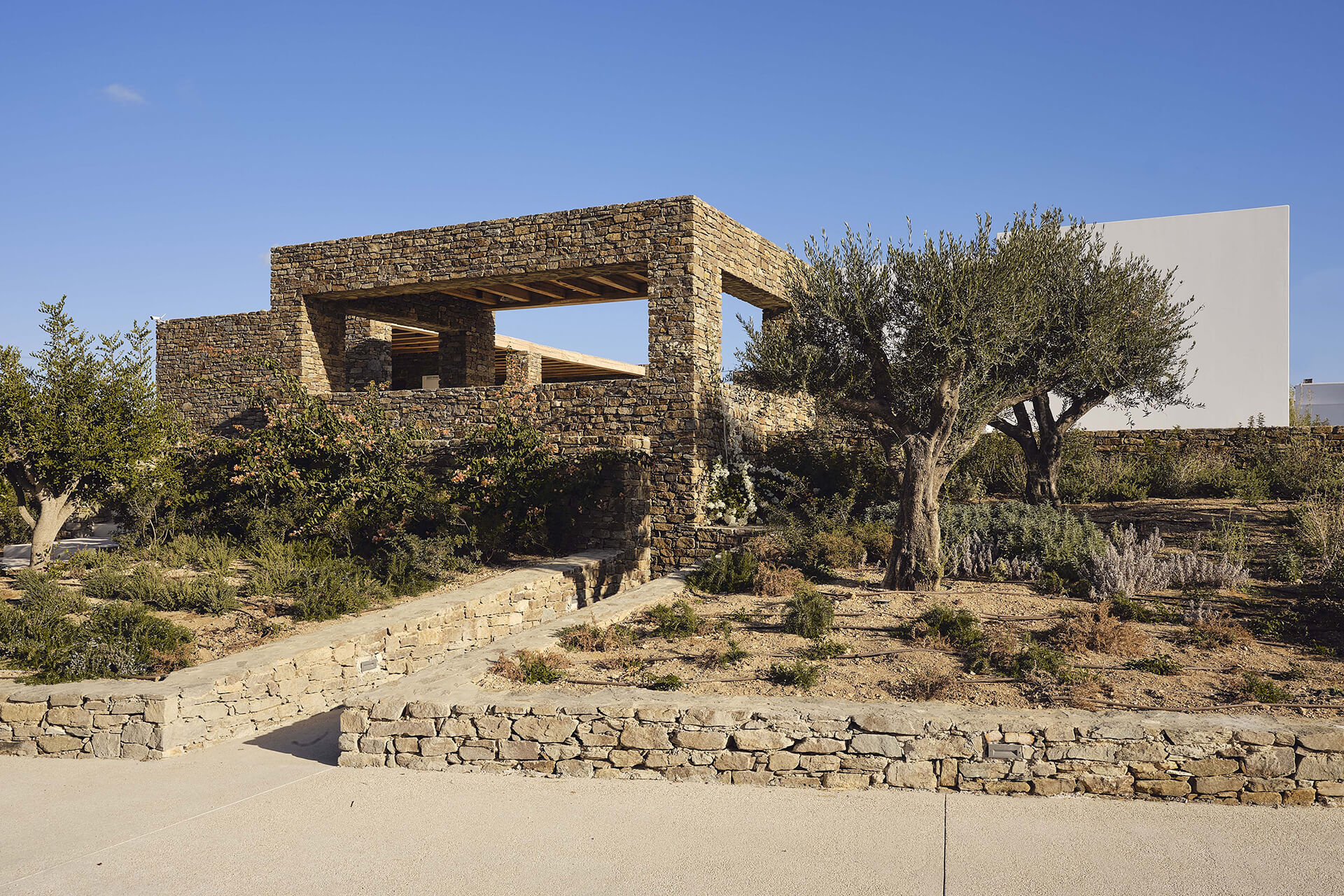 An existing concrete structure forms the point of departure for the project. Such frames became a familiar presence in the Greek landscape following a regulation that allowed building permits to remain valid if only the structural skeleton was constructed. By the time the project began, this concrete frame had stood unfinished for more than a decade. Its reuse was a deliberate choice, directly addressing issues of sustainability, economy, and legislation – concerns that are particularly pressing in the context of overtourism in the Cycladic islands.