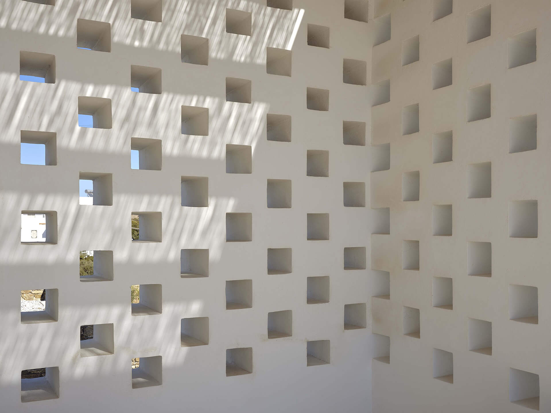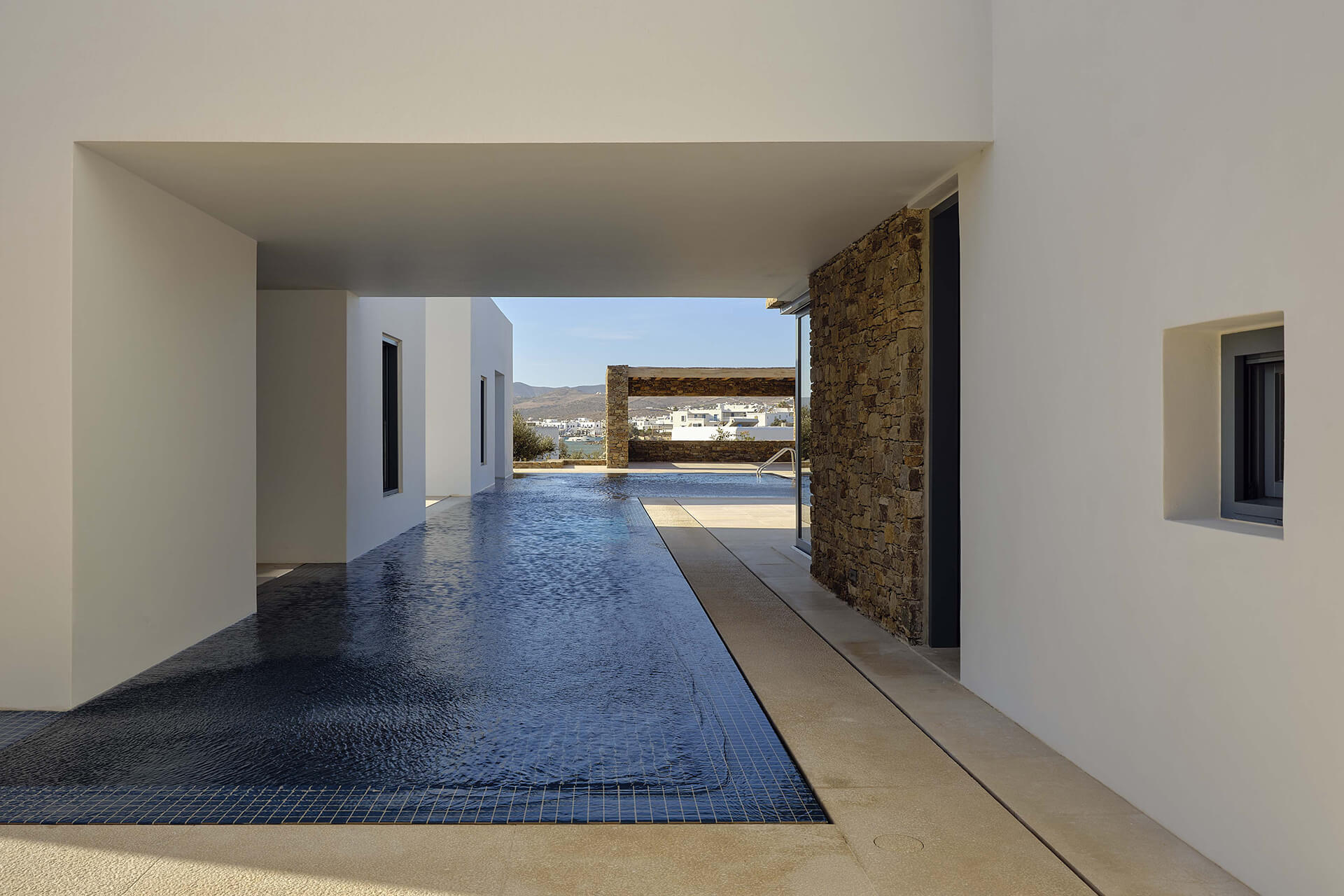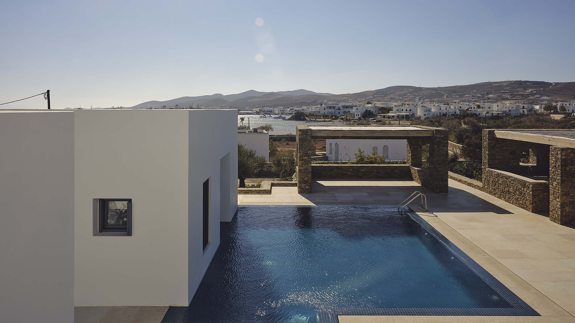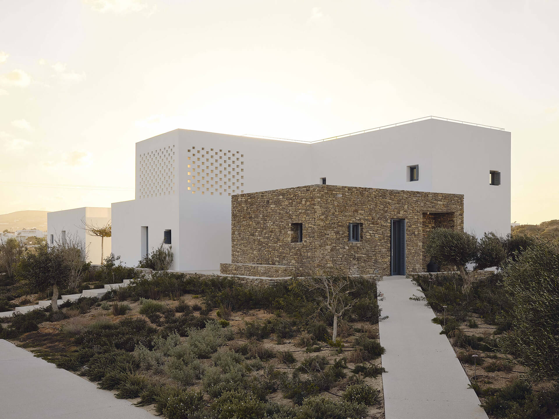 An existing concrete structure forms the point of departure for the project. Such frames became a familiar presence in the Greek landscape following a regulation that allowed building permits to remain valid if only the structural skeleton was constructed. By the time the project began, this concrete frame had stood unfinished for more than a decade. Its reuse was a deliberate choice, directly addressing issues of sustainability, economy, and legislation – concerns that are particularly pressing in the context of overtourism in the Cycladic islands.