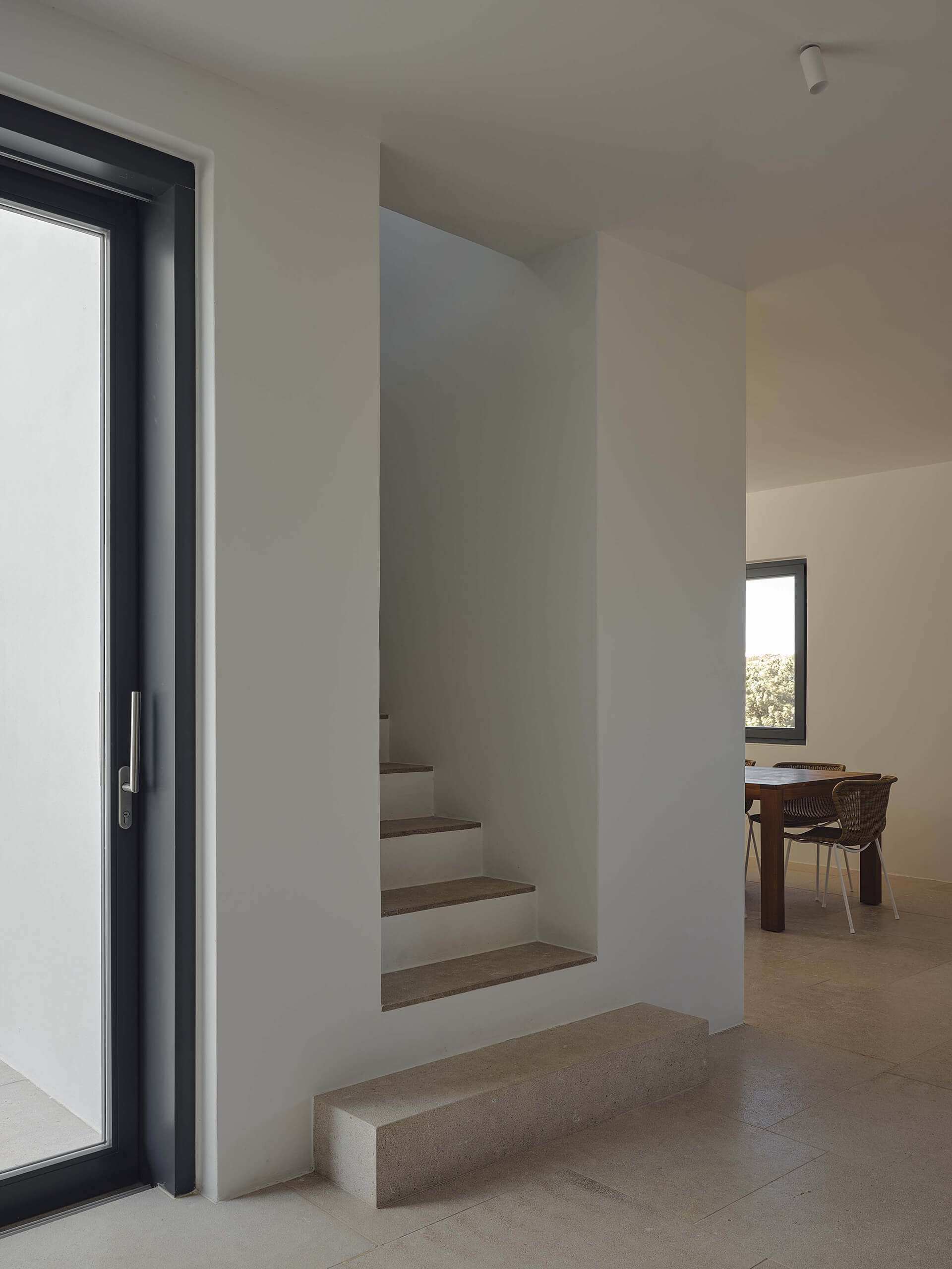 Beyond standard strategies such as cross-ventilation and high-performance thermal insulation, a skylight positioned above the interior staircase transforms it into a passive cooling tower. Photovoltaic panels generate sufficient energy for autonomous operation, reducing reliance on the local grid. Native trees and vegetation, selected for their low water demand, help filter views toward neighboring hotel facilities, ensuring privacy while acknowledging the realities of building within an existing village fabric.