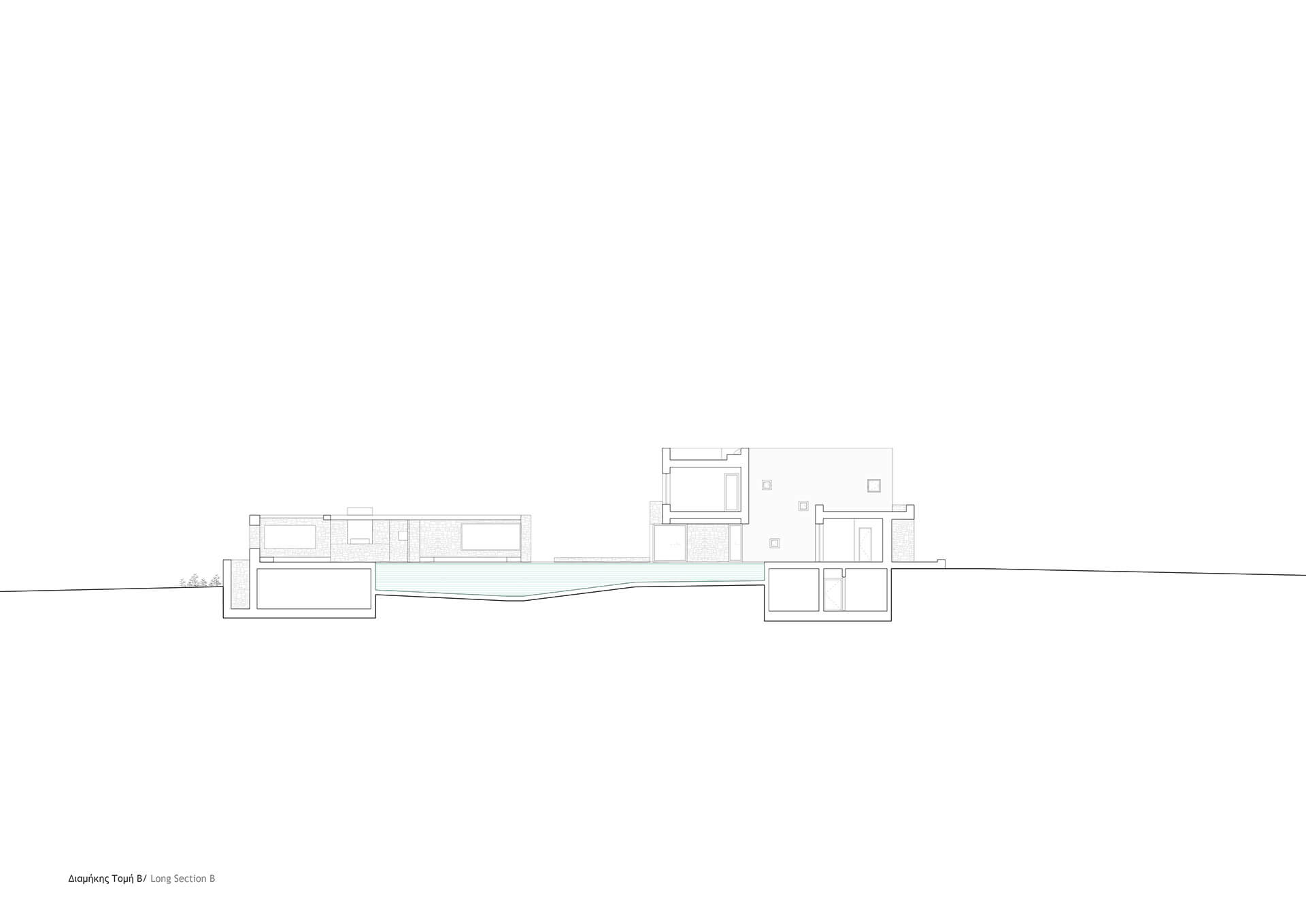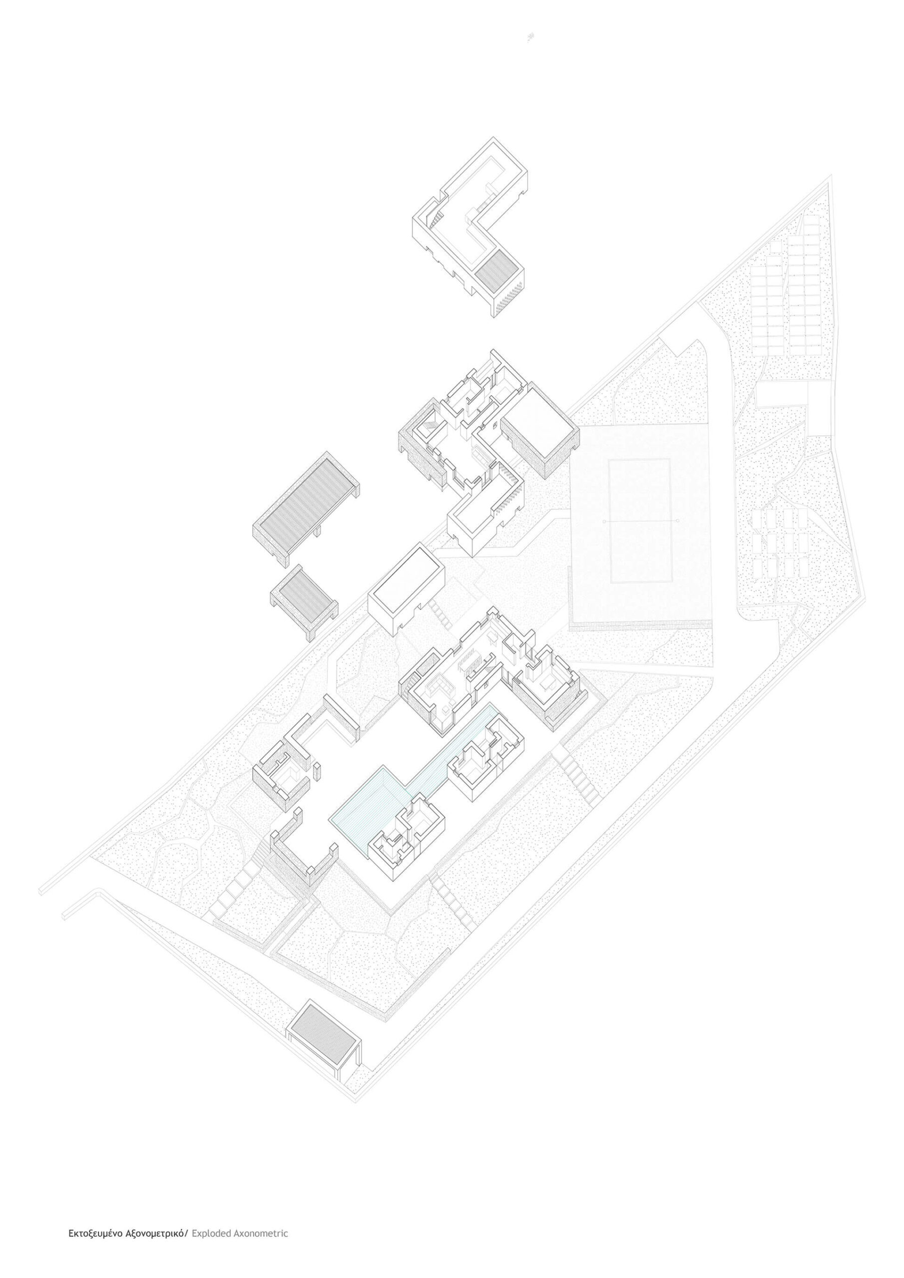 At ground level, volumes are arranged around a central pool to form an inner courtyard, mediating between privacy and openness toward anticipated or existing construction. This configuration moves away from a conventional sequence of enclosed rooms, proposing instead a communal mode of living in which water becomes the focal point of daily life.