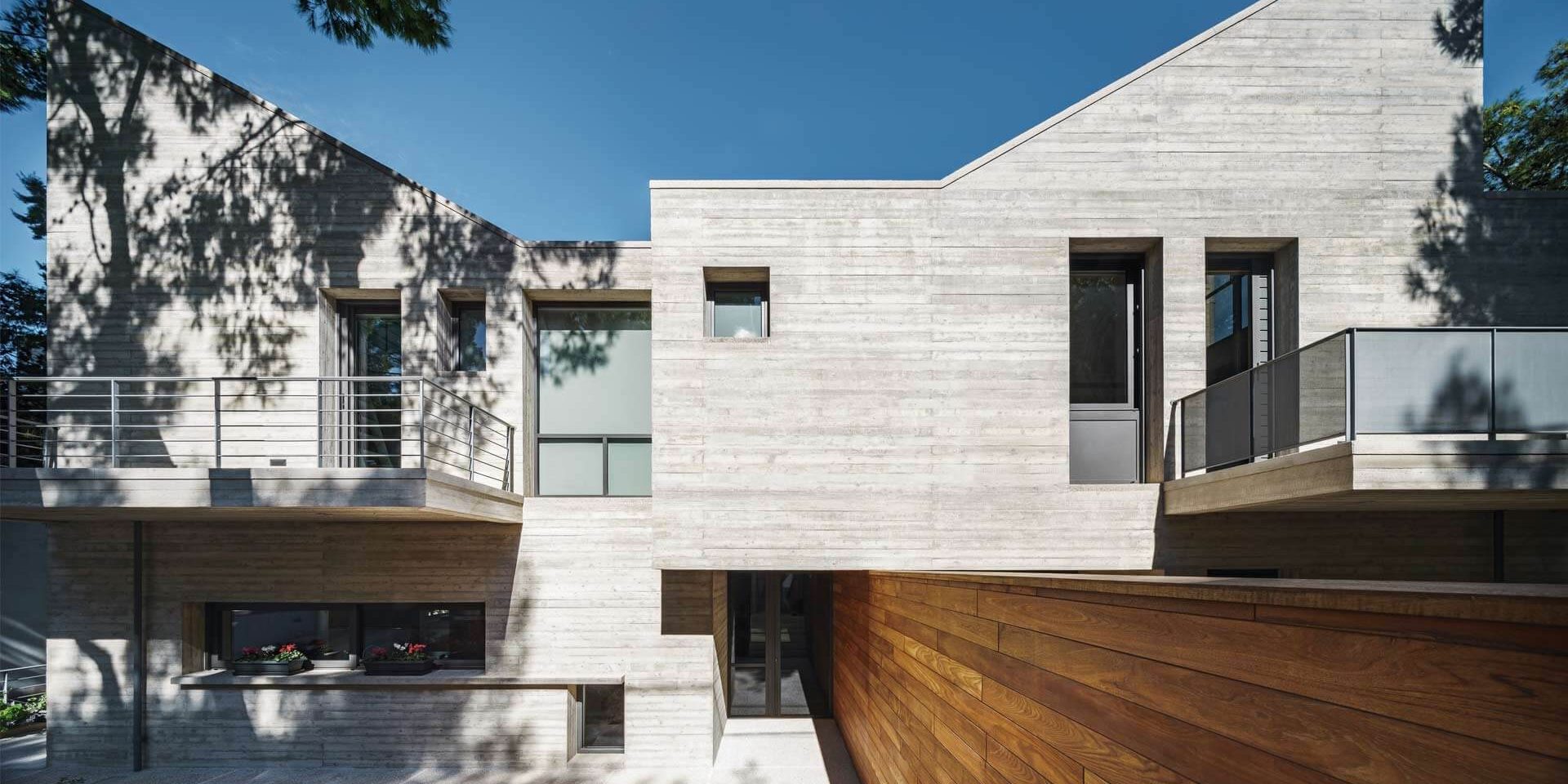 All external facades, as well as parts of the structural frame in the interior, are built in bare reinforced concrete with a visible formwork of lightly smoothened horizontal and vertical boards. Sloping roofs finalize the volume and allow light and air into the bedrooms. The terrace accommodates light wells for the service areas.