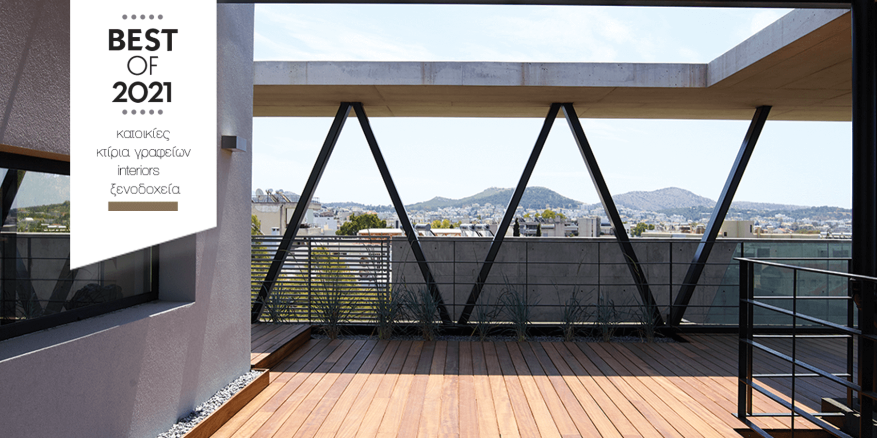 The apartment building is on the main commercial street of Voula in South Athens, an area of vigorous new housing construction. The elongated property allowed the design of two separate building volumes, divided by a water surface and garden on the ground level in-between. The absence of a fence on the ground level facilitates communication between the private and public, urban space. The building shell, with horizontal and vertical fair-face concrete planes, creates a shield against adjacent buildings and provides uniform light diffusion in the house interiors. The shading cantilevers appear to float over V-shaped supports. The project involves 12 independent, cross-ventilated houses, on one or two levels, with large balconies equipped with mini pools. The penthouses are shaped in roof gardens enjoying panoramic views. The buildings are connected on the first underground level (parking, equipment, storage) while the double-height ground floor can operate independently, accommodating retail or bar-restaurant uses.