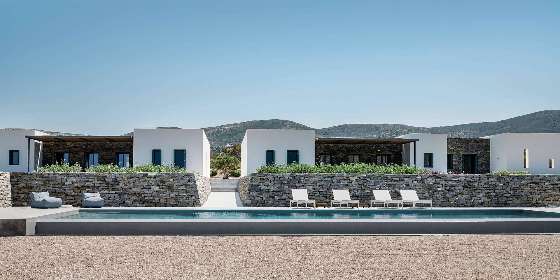 Two residences are positioned on the eastern point of a plot overlooking the bay of Naoussa and Kolymbithres beach, with courtyards forming the connecting element between them.
