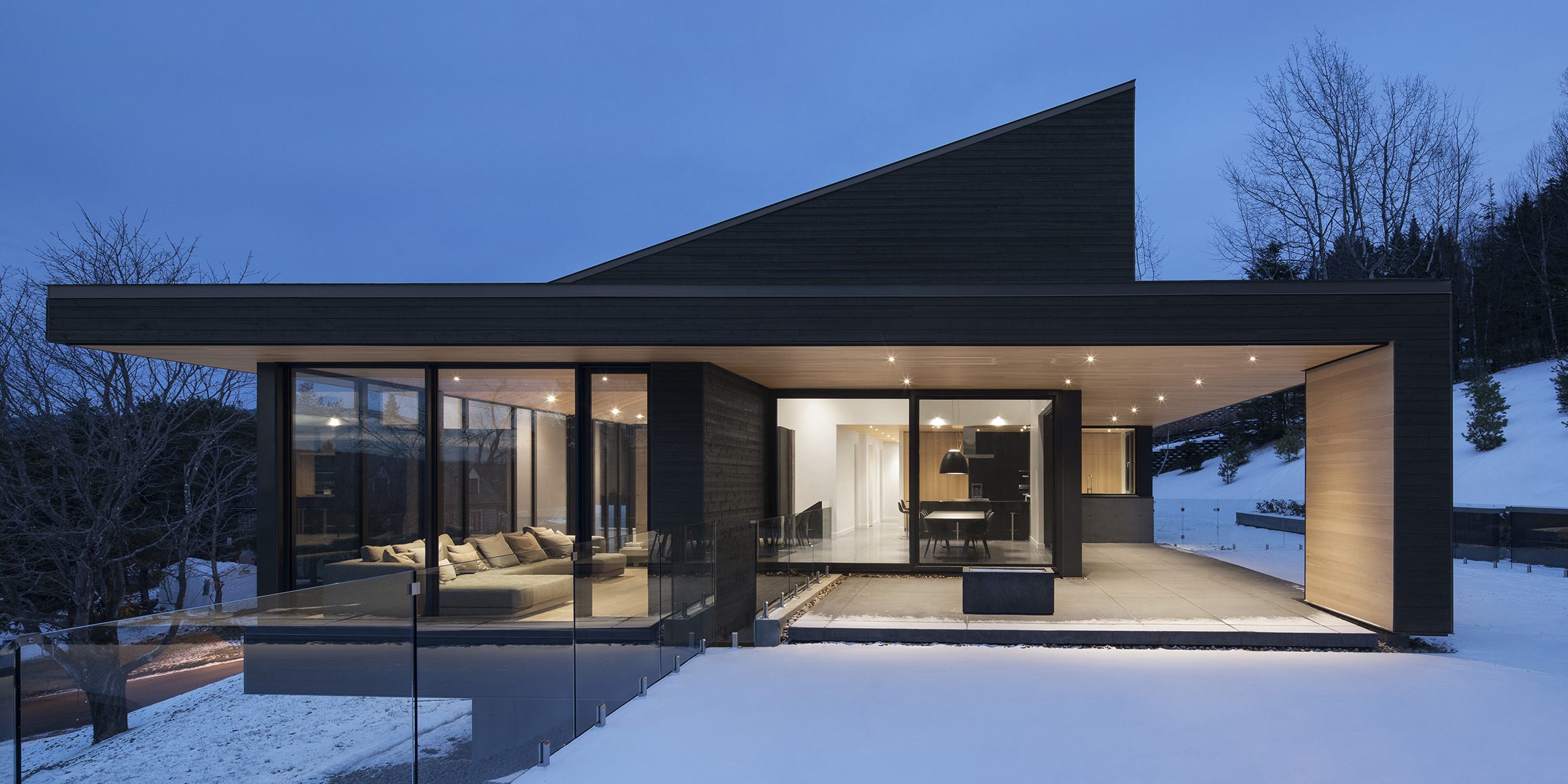 The residence is anchored on a sloping site next to the ski resort Le Relais, in Lac-Beauport, Canada. The plot site and its accentuated relief, offering magnificent views of the Laurentian hills and Lac-Beauport’s residential area, inspired the building design.