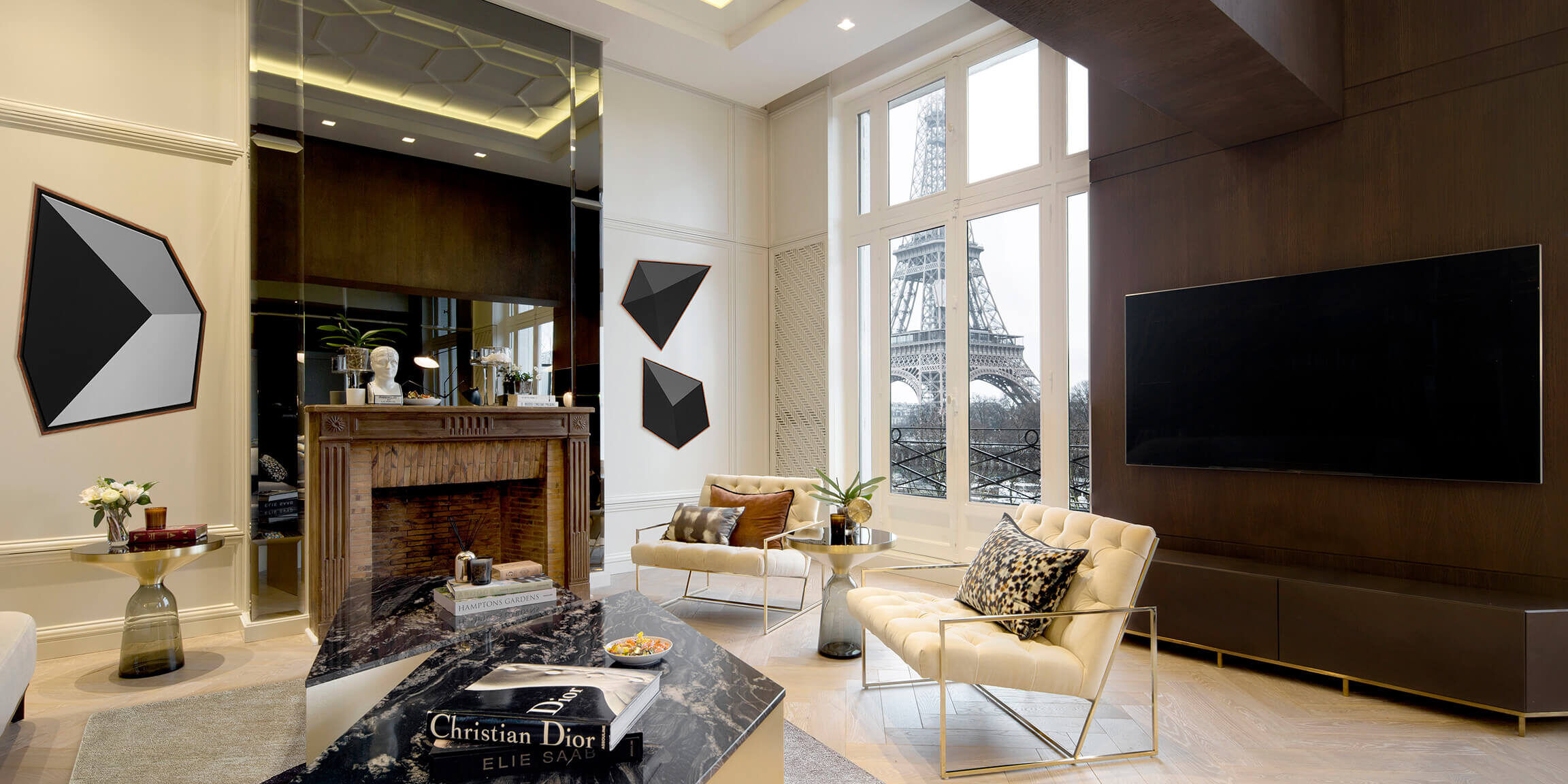 The three bedroom apartment is situated on the fourth floor of an old building on the North bank of the River Seine, overlooking the Eiffel Tower. Its remodelling combined a bespoke contemporary style with French neo classic elements, characteristic of the quiet 16th Arrondissement of Paris. Existing narrow passageways and high ceilings steered the overall design direction and the conceptualisation of creative alternatives. The vision was to accentuate the high ceilings to capture views and draw light into the space. The result is a clean, calm space, in which the spectacular Parisian setting take centre stage, and clever refinements to existing architecture add charm and character. Stepping out of the lobby, an open plan space incorporating the kitchen, breakfast and sitting area spans the full depth of the apartment. The monochromatic kitchen space carefully balances old with new: the diamond pattern on the stained glass windows, repeated in the ceiling design, seems to reflect the structure of the Eiffel Tower, whilst custom radiator covers – set within the architectural lines of the existing frame – are patterned to reflect the new herringbone floor. In the salon, the view is perfectly reflected in floor to ceiling smoky mirrors on the side wall behind the sofa and the restored original fireplace, creating a grand illusion of space. The wall panelling that starts in the kitchen and wraps along the inside wall of the salon conceals a door to the master bedroom, behind the breakfast table, and integrates a custom made bookshelf with a book-ladder behind the sofa, creating a library feel. An internal clerestory window at its top allows natural light into the adjacent master en-suite. The walls are made up of white panelling crisply aligned to respect the existing door frames. Abstract, geometric paintings by contemporary South African artist Andrzej Urbanski add a playful inset to the panelled walls on either side of the fireplace. Finally, the bespoke, custom designed bathrooms use a black and white palette, with touches of bronze and copper bringing a playful dash of colour and surprise.