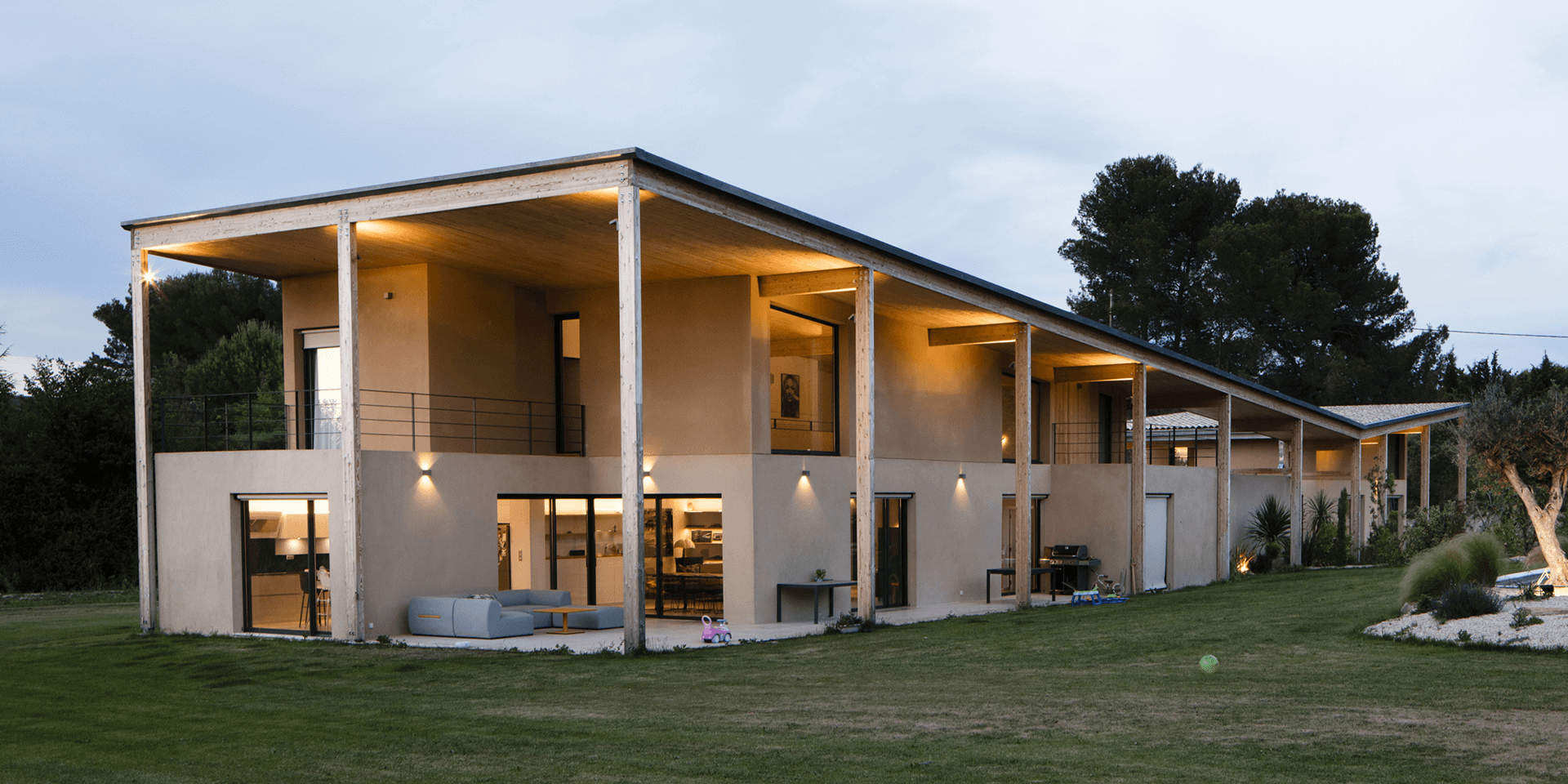 This is a project of two individual houses grouped. A family from Aix-en-Provence living abroad but very attached to its motherland wanted to build two contemporary houses able to accommodate all or part of this family. Two independent houses responding to versatile uses: partial occupation, partial or complete rent, permanent or seasonal, future extensions.