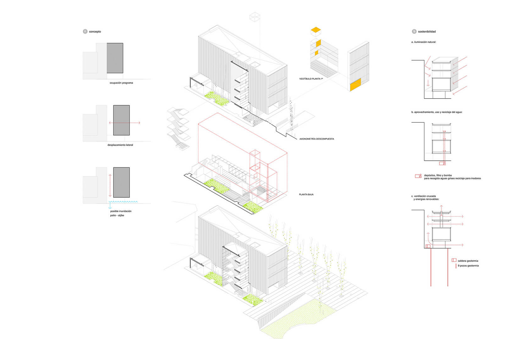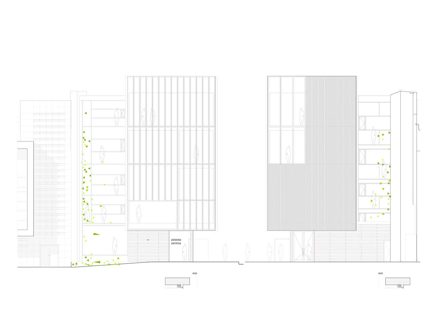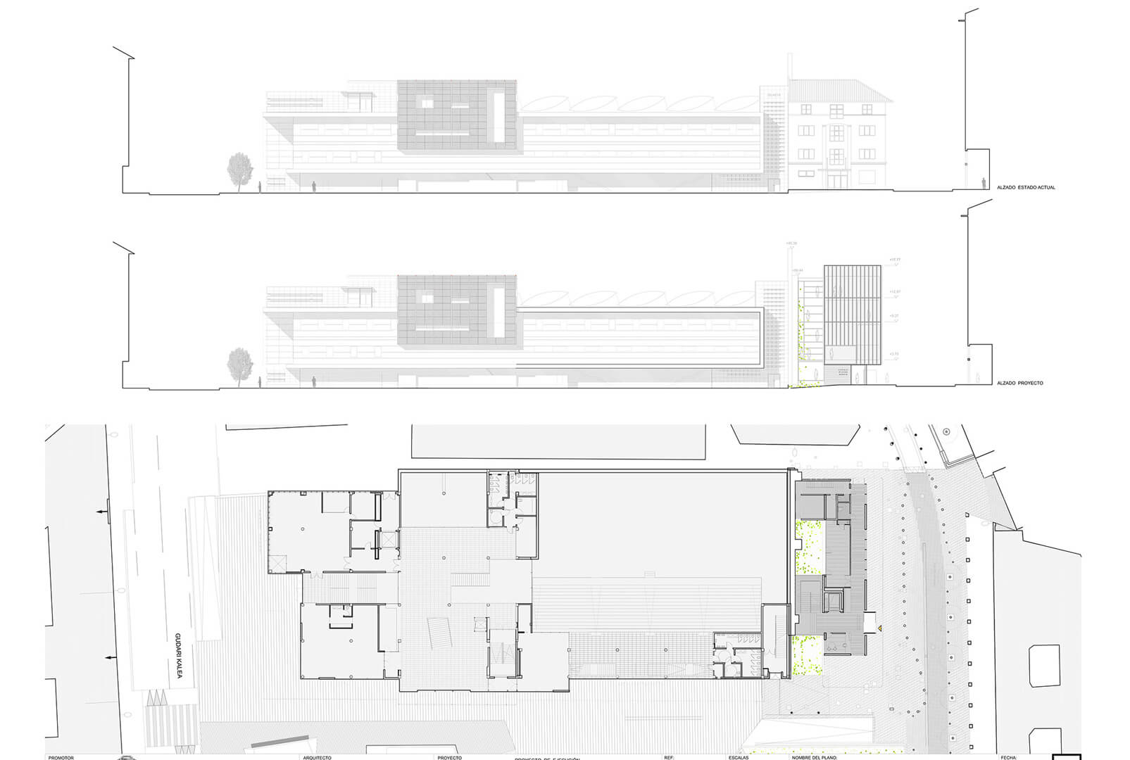 The building transforms the existing dividing wall into an additional façade, completing and redefining the perimeter of the current complex. The original wall of the adjoining frontón ballcourt is preserved and elevated as the central protagonist of the intervention. By exposing and layering the successive walls, the project makes the passage of time legible, allowing traces of the site’s history to remain visible. In doing so, the design safeguards local heritage and collective memory, integrating them into the contemporary architectural language.