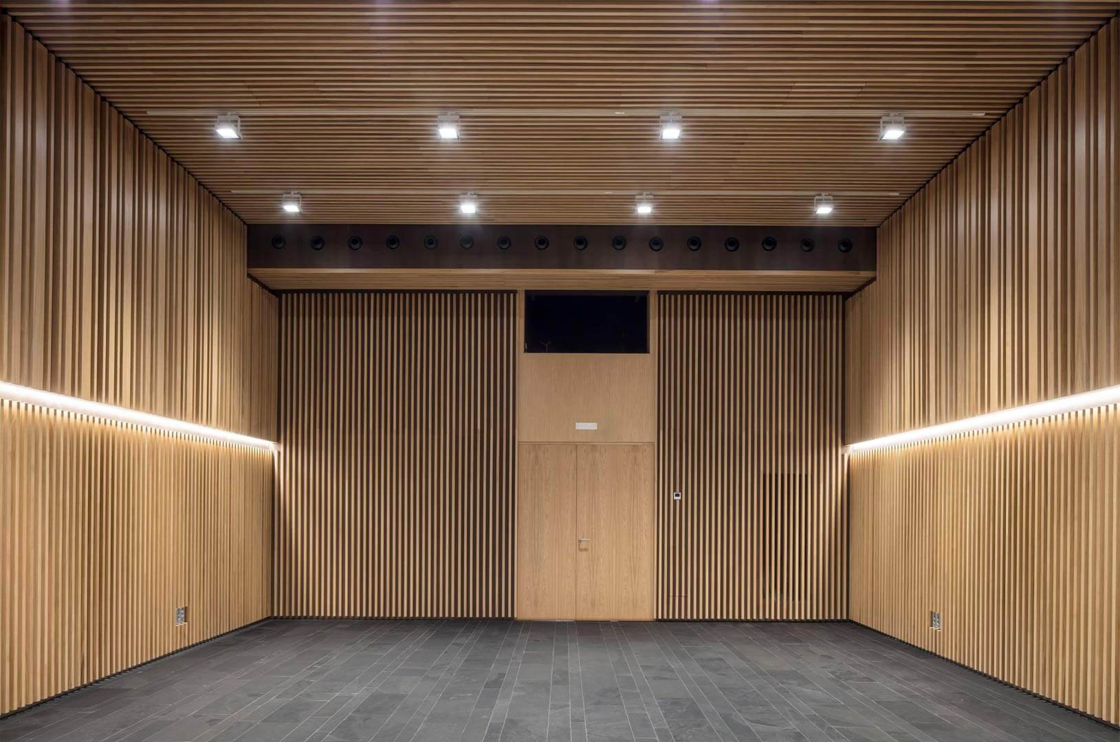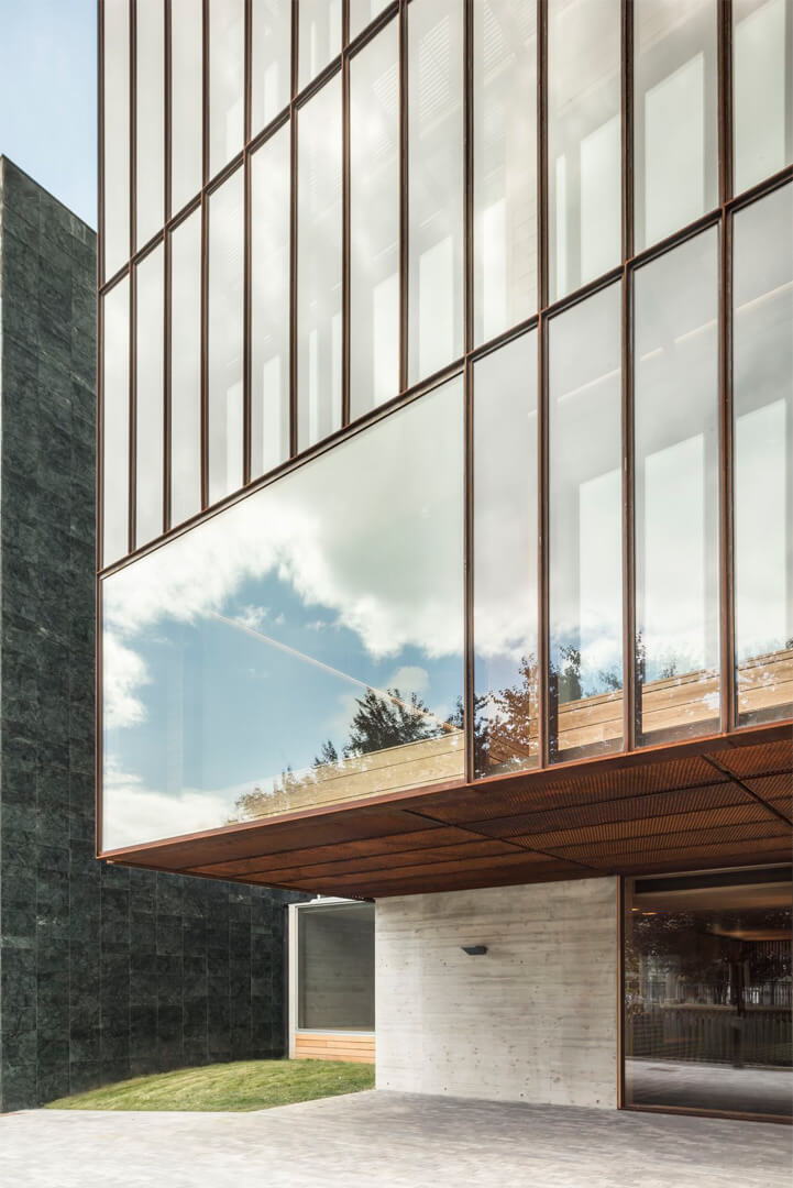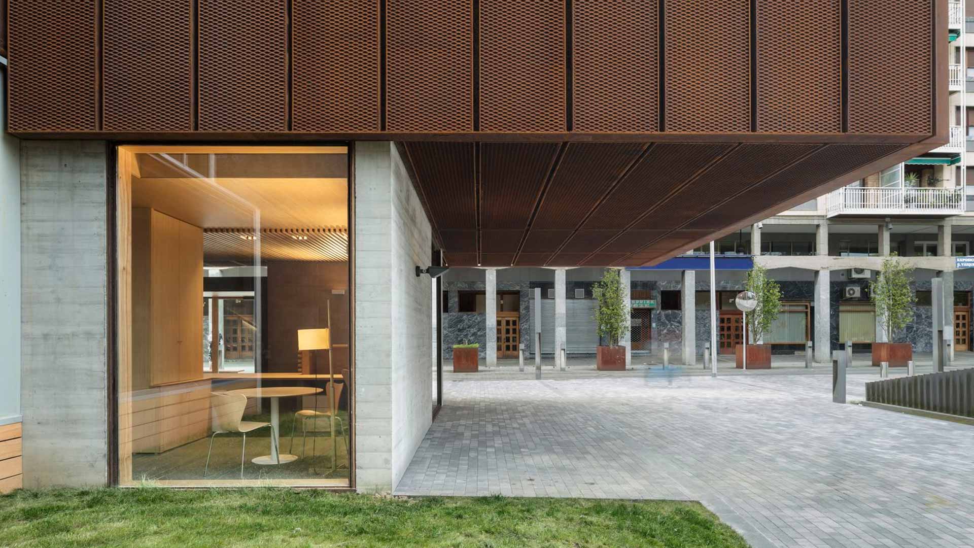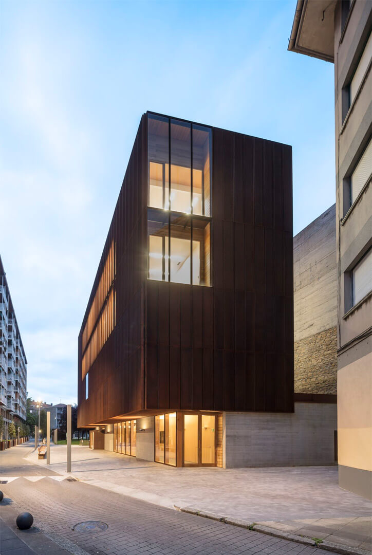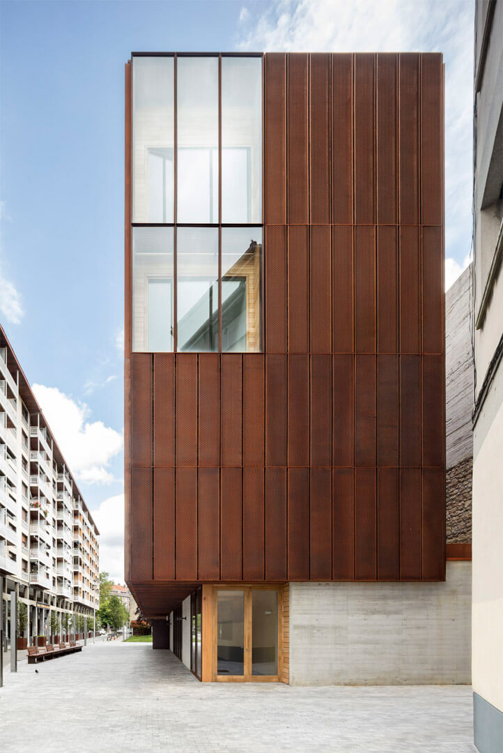 Once the formal autonomy of the neighboring cultural center is acknowledged, the Musika Eskola operates as an independent volume. It respects the orthogonality and abstraction of the surrounding structures, yet distinguishes itself as a singular and recognizable element within the ensemble.