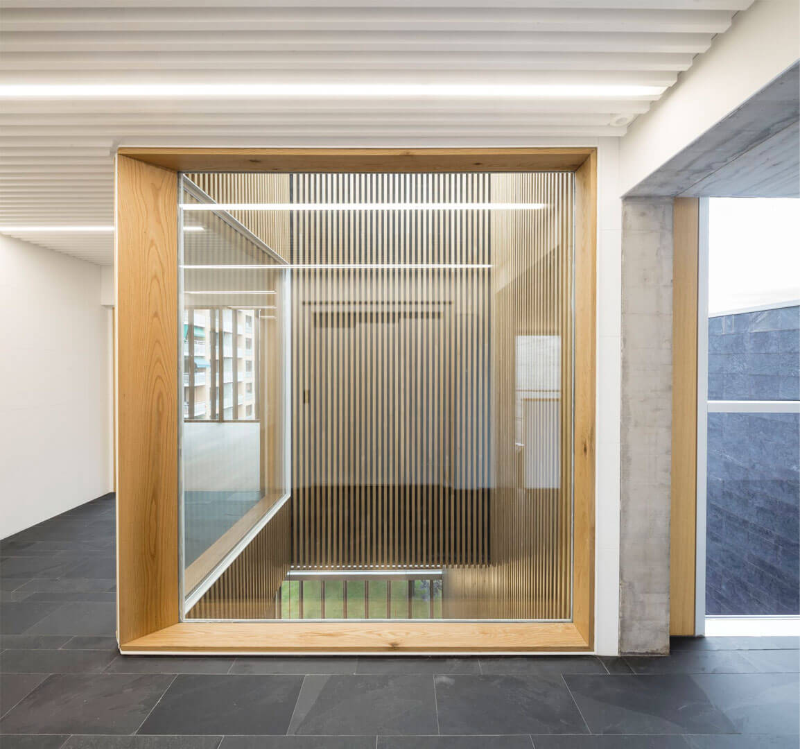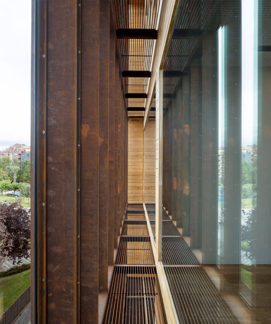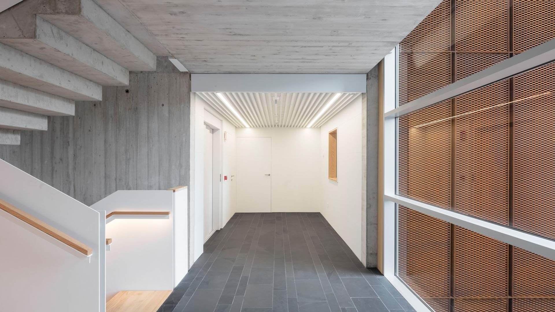 The staircases are positioned outside the primary prism and enclosed in glass, heightening transparency and reinforcing the building’s abstract character. More than a circulation device, the stair becomes an architectural promenade: it frames views toward the adjacent park, reveals the scale of the internal courtyard, and underscores the building’s identity as an extended, cohesive, and singular spatial composition.