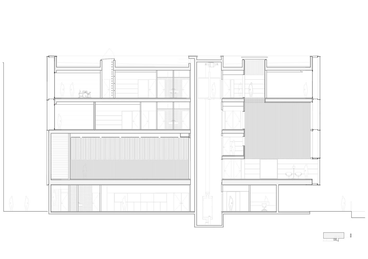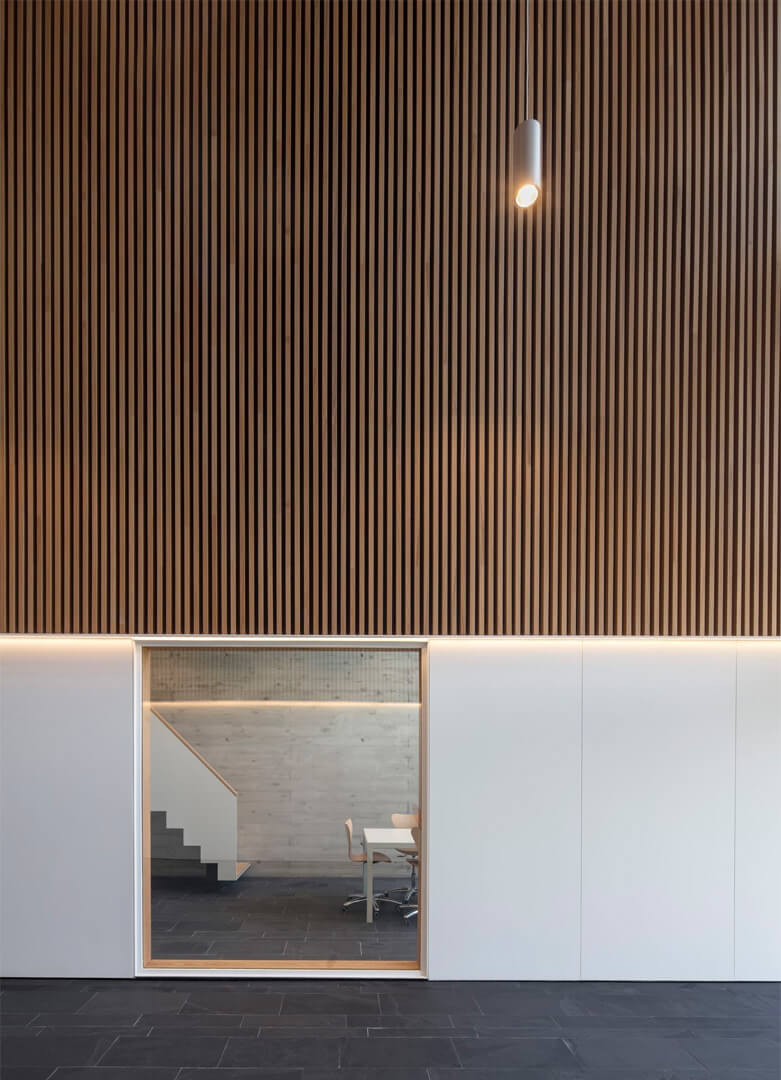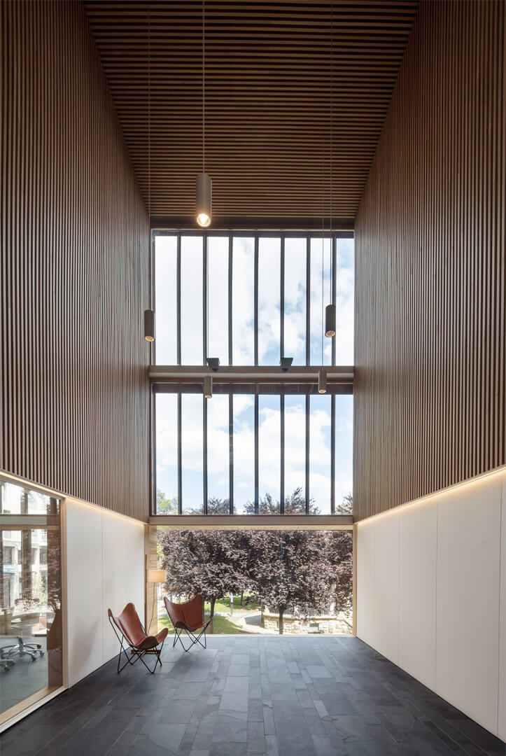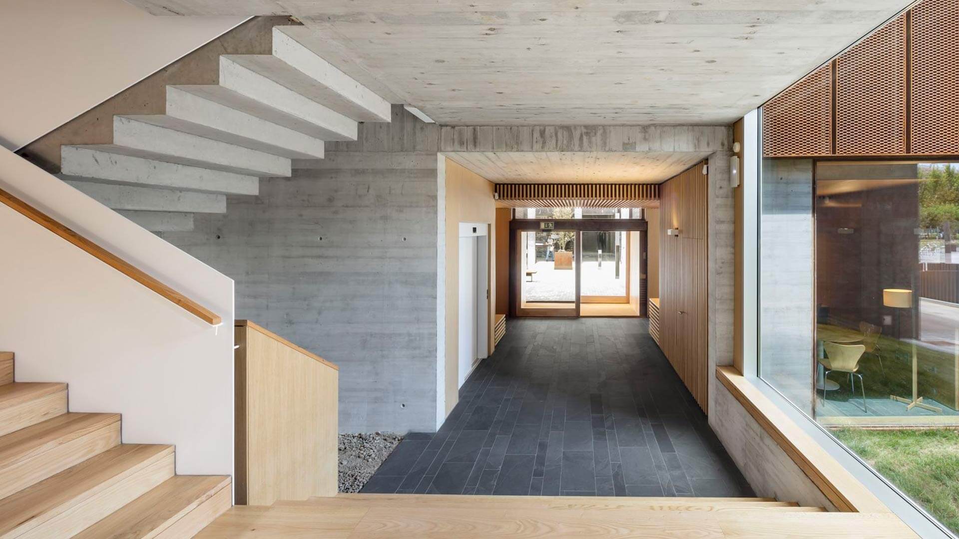 The staircases are positioned outside the primary prism and enclosed in glass, heightening transparency and reinforcing the building’s abstract character. More than a circulation device, the stair becomes an architectural promenade: it frames views toward the adjacent park, reveals the scale of the internal courtyard, and underscores the building’s identity as an extended, cohesive, and singular spatial composition.