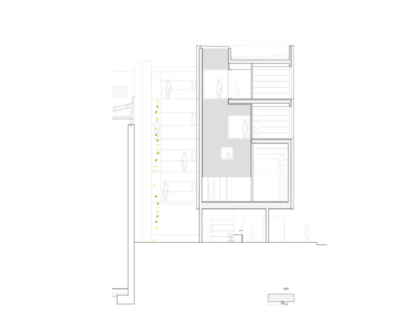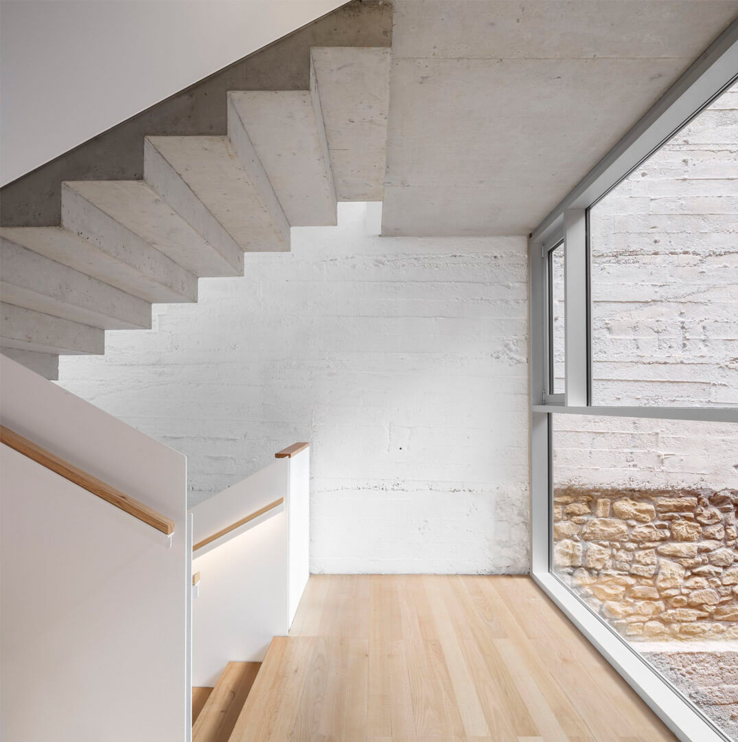 A subtle setback from the longitudinal façade creates a sheltered porch at ground level, marking the main entrance and reinforcing its civic presence. Above, the upper floors complete the program in the form of a regular three-story prism, arranged parallel to the new façade-wall and complemented by a projecting corbel. The compact floor plates maximize usable surface area, forming an efficient and clearly defined spatial container.